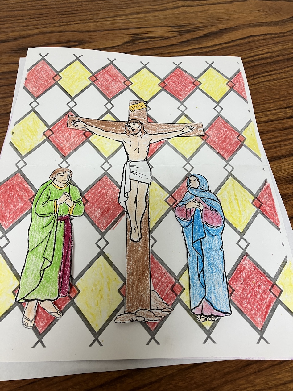 - Put two foam squares on the back of the image of Our Lady and two on St. John. Stick three on the back of the Crucifixion image.
