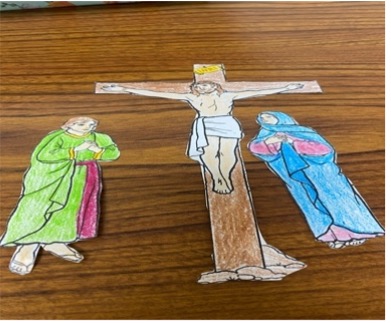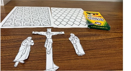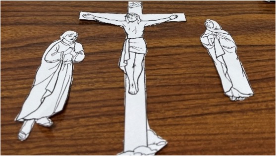 - Download and print the Crucifixion template on cardstock paper. Cut out Our Lady, St. John and Our Lord hanging on the Cross. See picture #1.