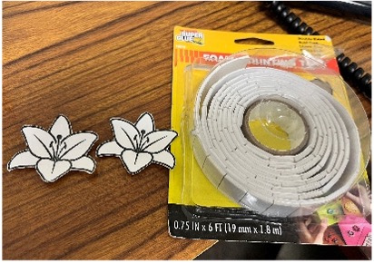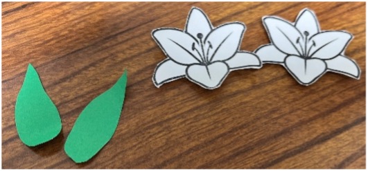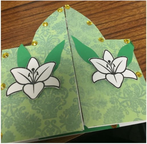 - Download and print the lily template. Cut out two lilies and glue one to the outside of each front piece. You can use foam squares for a 3D effect. See picture #3.