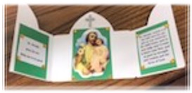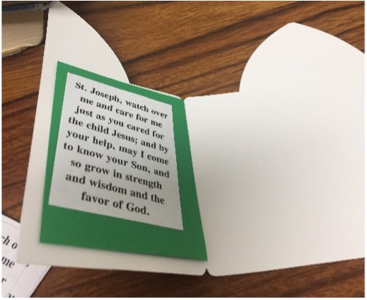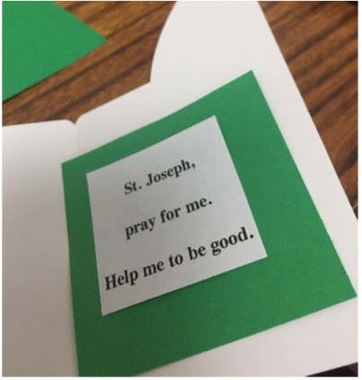 - Cut two rectangles of paper measuring 2” x 2½”. Glue inside doors of shrine. See picture #6. Download, print, cut out and glue on the prayers to St. Joseph. See picture #6A.
