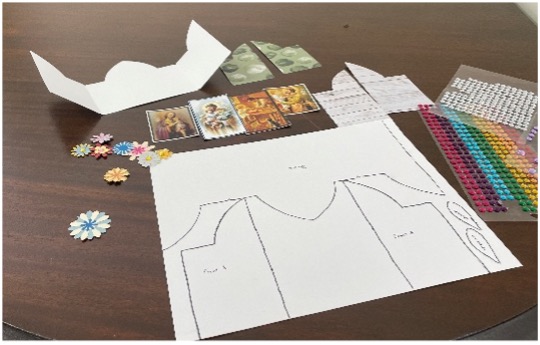 - Download and print the stencil template. Use the template to cut out the shrine on cardstock. It must be a heavy paper or it won’t stand up. See picture #1. Cut out other stencils and set aside. Fold shrine along lines.